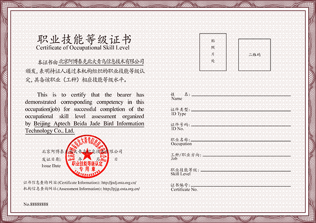 北大青鸟作为人力资源和社会保障部发布的首批职业技能等级认定第三方评价机构,所颁发的职业技能等级证书是由人力资源社会保障部认证的职业证书。职业技能等级认定的五级(初级)、四级(中级)、三级(高级)、二级(技师)、一级(高级技师),分别对应国家职业资格的相应等级。
